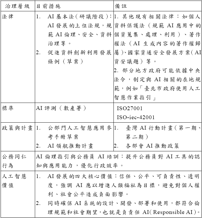 本研析回顧並蒐集國際上主要的人工智慧治理參考文獻,包括歐盟、美國、英國、澳洲等國家,以及聯合國(UN)、麻省理工學院(MIT)、經濟合作暨發展組織(OECD)和七大工業國組織(G7)等國際組織或研究單位的相關報告和倡議。並透過次級資料分析和專家訪談,盤點我國政府人工智慧應用類型與場景,包含「數位國家。創新經濟發展方案(DIGI+) 2023」(40案)、「政府服務獎(第1-6屆)」(32案)、「臺北市政府」(28案);專家訪談對象則涵蓋資安專家、內政部、環境部、臺北市政府和會計稽核人員。據以建立五個階層的「人工智慧治理架構與措施建議」,包含法律、標準、政策與計畫、公務同仁行為、人工智慧價值。以及依據計畫、執行、查核與行動(PDCA)循環管理理念,建構一套四大構面、可持續優化的人工智慧推動模式,作為我國公部門因應人工智慧發展挑戰與創新需求的制度性參考。