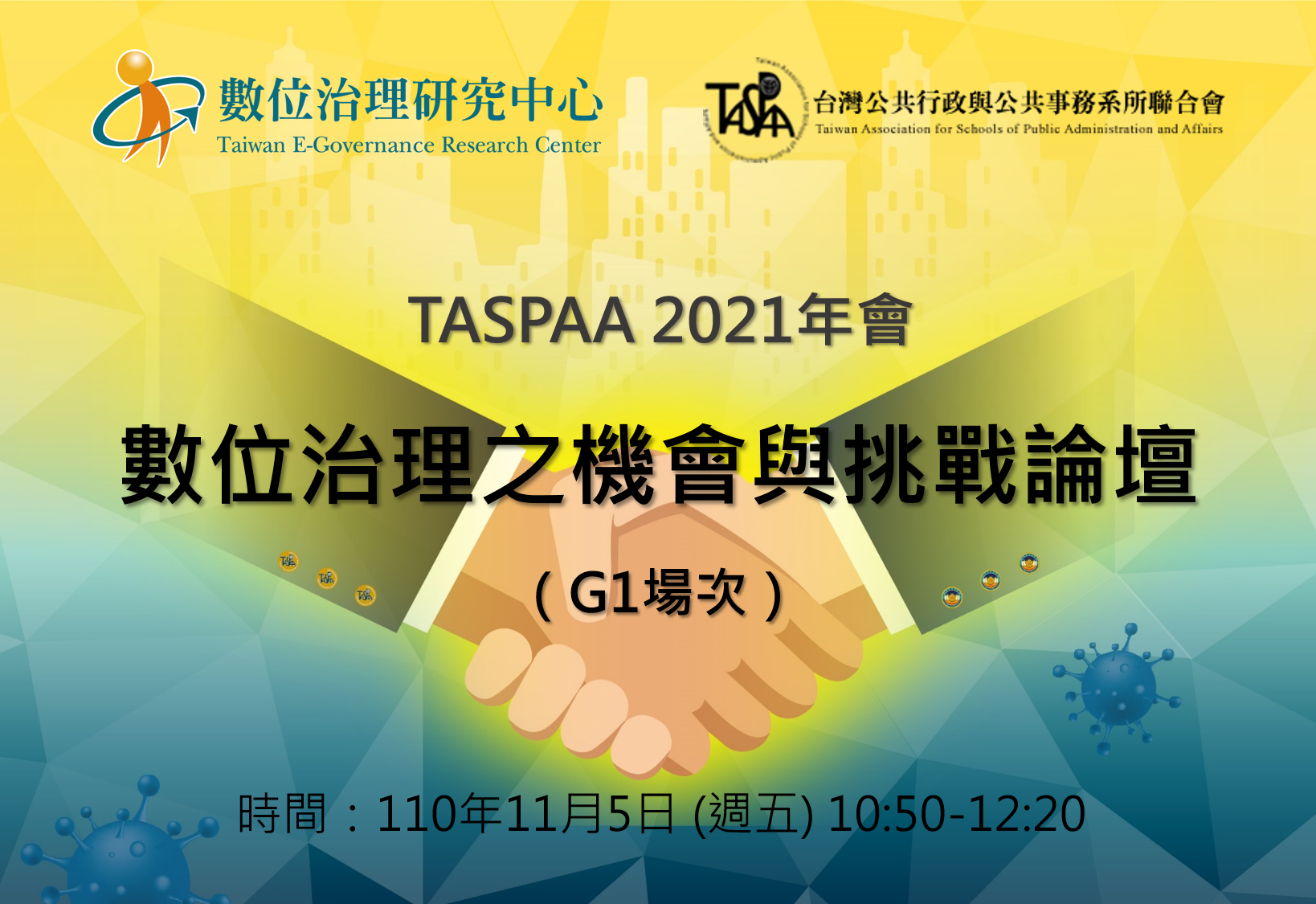 臺灣公共行政暨事務系所聯合會(Public Administration and Affairs, TASPAA)2021年會將於11/5-11/6採實體與線上同步進行,主題為「後新冠肺炎的公共行政:專業行政與跨域協力」,主辦單位為中央警察大學。